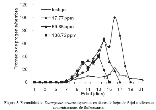 Datos que revelan un efecto similar, es decir una reducción en el valor de Ro a bajas concentraciones, están aquellos registrados por Marcic (2007) quien indicó que el producto spiridiclofen reduce la tasa reproductiva neta de T. urticae de 28.92 en el testigo a 23.35 y 6.45 para concentraciones subletales de 6 y 12 mgL-1, respectivamente; por su parte Saenz-de-Cabezon et al. (2006) indicaron valores de Ro de 14.40 y 5.016 para el testigo y la aplicación de 1 gL-1 de Alsystin (250 g de triflumuron Kg-1), respectivamente.