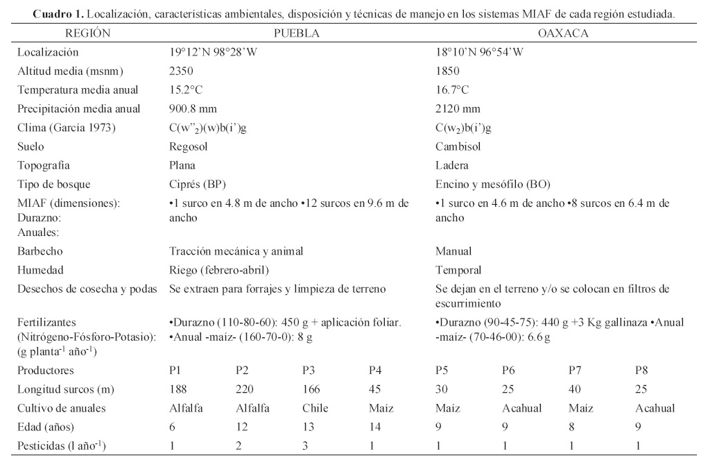 Sitio de estudio y características edáficas, climáticas y de manejo. Esta investigación se llevó a cabo en parcelas MIAF de campesinos manejadas bajo el sistema intercalado Milpa (maíz, alfalfa, chile, gladiola o frijol) - Durazno, en la región de Chiautzingo y Huejotzingo, Puebla y la región Mazateca en San Jerónimo Tecoatl, Oaxaca. En cada una de las regiones se seleccionaron cuatro MIAFs de diferentes campesinos, y como control una área de bosque (BP - Puebla, y BO - Oaxaca) cercana y representativa de la vegetación original de cada región. Los datos sobre la ubicación y otras características ambientales y de manejo de las dos regiones y de cada uno de los MIAFs se presentan en el Cuadro 1.