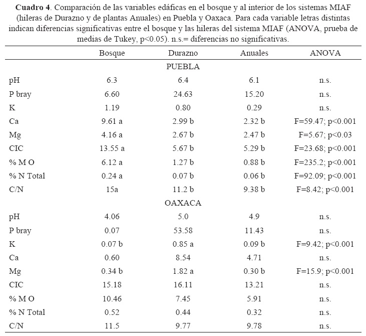 En Puebla, los bosques fueron mucho más ricos en cationes (Ca, Mg, CIC), MO y N que los suelos cultivados; al interior de los sitios MIAF no hubo diferencias en ninguno de los parámetros edáficos analizados (Cuadro 4). En Oaxaca solamente se observaron diferencias en K y Mg; sin embargo, los mayores valores se encontraron en la zona de árboles frutales.