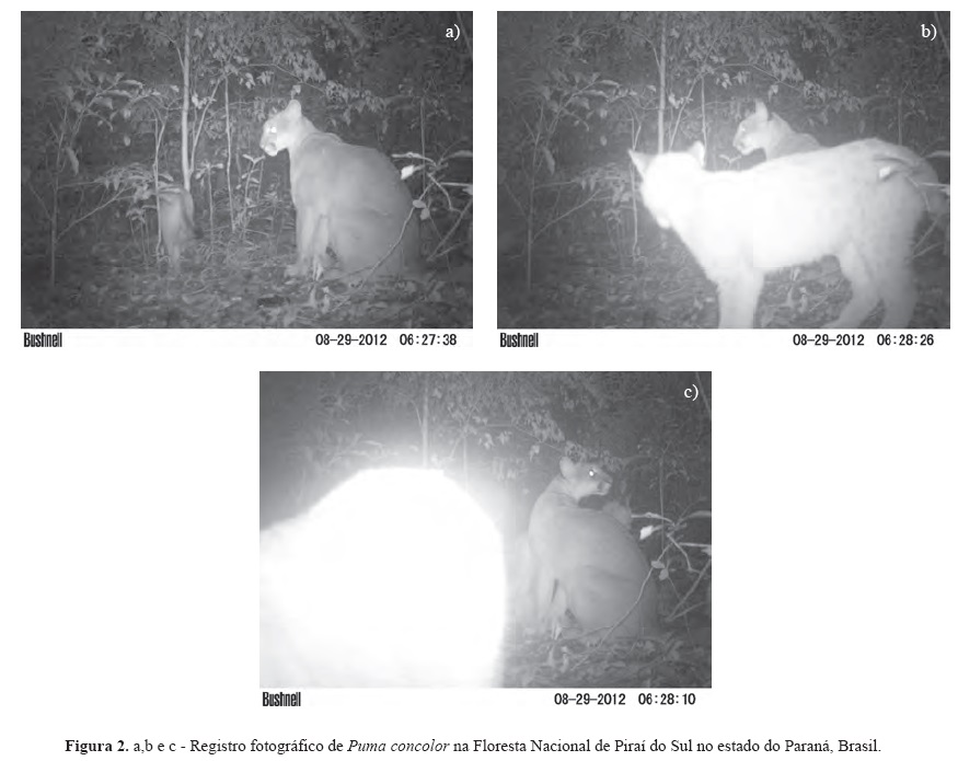 Com esforço de 280 km a percorridos a pé, totalizando 135 horas de esforço amostral de busca direta, dentre as quais foram coletadas 43 amostras fecais, 27 registros de pegadas e 21.600 horas de armadilhamento fotográfico, obtendo 1.844 fotos das quais 36 são pertencem a Família Felidae. Foram registradas cinco espécies de felinos na Flona de Piraí do Sul sendo: Leopardus pardalis, Leopardus tigrinus, Leopardus wiedii, Puma concolor (Fig. 2), Puma yagouaroundi. Através da análise do material escatológico foi encontrado o pelo do autor, ou seja, da espécie que defecou e através da identificação dos padrões micro-estruturais dos pelos foram identificados de acordo com Quadros e Monteiro-Filho (2006a) cinco espécies por este método, constituindo em 53% das amostras de L. pardalis, 19% de P. yagouaroundi, 12% de L. tigrinus, 9% de P. concolor e 7% de L. wiedii. Através de pegadas 69% dos registros foram de P. concolor, 23% de L. pardalis e 8% de L. tigrinus, não sendo registradas L. wiedii e P. yagouaroundi por este método. Por meio de visualização foi registrado na região sudeste da flona uma fêmea de jaguatirica com seu filhote. E através do armadilhamento fotográfico a espécie mais abundante foi P. concolor com 69% dos registros fotográficos (dentre estas, nove foram com seus dois filhotes), seguida de L. pardalis com 13% e L. tigrinus, L. wiedii e P. yagouaroundi com 6% para cada espécie.