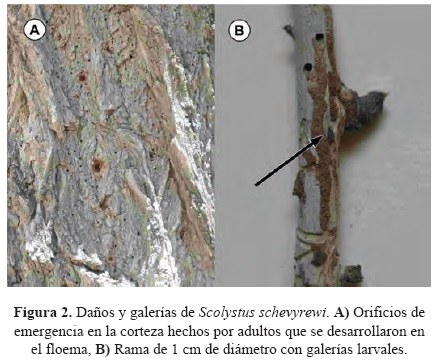 A mediados del mes de marzo del 2011, se observaron en el campus de la Universidad Autónoma Chapingo, ubicada a una altitude de 2,200 msnm y coordenadas geográficas 19.467 y -98.867, varios árboles de Ulmus pumila L. (olmos) que presentaron marchitamiento, decoloración del follaje y una pudrición de raíz causada por el hongo Ganoderma resinaceum Boud. En mayo, de ese mismo año, los olmos presentaron la copa de color gris, sin follaje y la corteza del fuste con una gran cantidad de orificios de emergencia, típicos de un insecto descortezado, por lo que se procedió a revisar la corteza, encontrándose adultos y larvas de diferentes tamaños en las galerías longitudinales (Figs. 1, 2). Se colectó una serie de 100 adultos, los cuales se montaron, etiquetaron y se guardaron en la Colección Entomológica del laboratorio de Parasitología Forestal de la División de Ciencias Forestales de Universidad Autónoma Chapingo, con el número de colecta 2755-A.