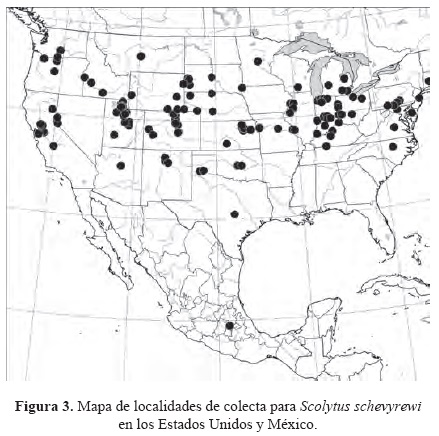 En los EUA, S. schevyrewi se detectó por primera vez en el año 2003, en Denver, Colorado, y poco después en Ogden, Utah. Muestreos subsecuentes demostraron que el descortezador ya estaba ampliamente distribuido en los dos estados (LaBonte 2010). Revisiones posteriores en colecciones documentaron su presencia desde 1994 en el estado de Colorado (Negron et al. 2005). Su dispersión ha sido muy rápida, ya que en 2005, Negron y colaboradores citaron su presencia en 21 estados, aunque Lee et al. (2009) la reportaron en un total de 28 estados y posteriormente en cuatro provincias de Canadá (Lee et al. 2011). Su distribución actual se presenta en Figura 3. En su continente de origen las distribuciones de S. multistriatus y S. schevyrewi no coinciden. Por su parte Lee et al. (2009) investigaron su coexistencia en los EUA, pero no pudieron ver indicaciones de dezplazamiento, ya que las dos especies actualmente coinciden sobre una parte grande de América del Norte.