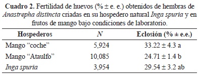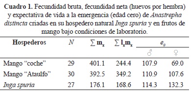 Fecundidad. Los resultados indicaron que en condiciones controladas y en ausencia de su hospedero natural, A. distincta fue capaz de infestar frutos de mango "coche" y "Ataulfo" y completar exitosamente su ciclo biológico. El peso promedio de las pupas provenientes de frutos de I. spuria fue de 11.2 ± 0.14 mg, en mango "coche" fue de II. 3 ± 0.10 mg, y en pupas procedentes de mango "Ataulfo" promediaron 12.6 ± 0.21 mg.