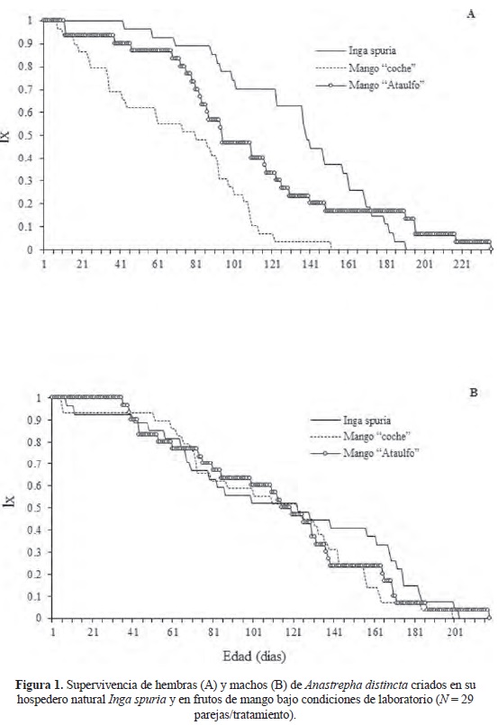 Longevidad y supervivencia. Las hembras recuperadas de los tres frutos presentaron diferencias significativas (F = 59.59; g.l. = 2, 573; P < 0.001) en su supervivencia (Fig. 1 A). La mayor supervivencia se observó en hembras recuperadas de su hospedero natural I. spuria, seguida de las hembras procedentes de mango "Ataulfo". Sin embargo, a partir de los 175 días de edad, el 20% de las hembras que registraron la mayor longevidad fueron las provenientes de mango "Ataulfo". Las hembras procedentes de mango "coche" presentaron una menor supervivencia desde la emergencia, alcanzando el 100% de mortalidad a los 150 días de edad. La supervivencia de los machos recuperados de los tres hospederos fue muy similar hasta los 121 días de edad, a partir de ésta edad la supervivencia de los machos procedentes de I. spuria fue mayor con diferencias significativas (F = 5).61; g.l. = 2, 615; P < 0.001) (Fig. 1 B). Tanto las hembras como los machos de I. spuria presentaron una mayor expectativa de vida a la emergencia (edad cero), en comparación con la observada en adultos de ambos sexos recuperados de mango "coche" y "Ataulfo" (Cuadro 1).