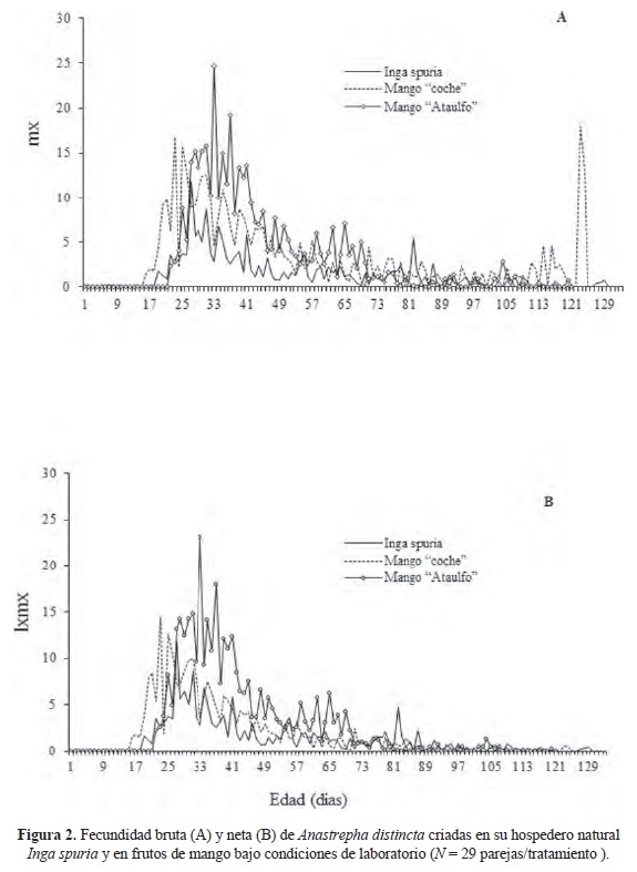 La mayor fecundidad bruta (Σmx) se registró en hembras criadas en mango "coche", en segundo lugar estuvieron las hembras recuperadas de mango "Ataulfo" y por último fueron las hembras criadas en su hospedero natural I. spuria. En cuanto a la fecundidad neta (Σ lxmx), las hembras provenientes de mango "Ataulfo" presentaron la tasa más alta, seguidas de las hembras de mango "coche" y la mas baja se presentó en las hembras provenientes de I. spuria (Cuadro 1). Las diferencias observadas entre los valores de la distribución diaria de la fecundidad bruta y neta fueron significativas (F = 14.8; g.l. = 2, 258; P < 0.001) (Figs. 2A y 2B).