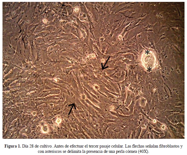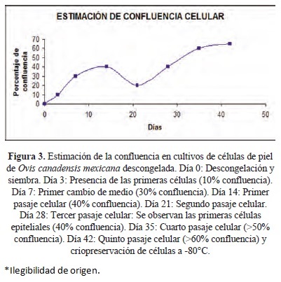 Con la muestra colectada, se obtuvieron los primeros fibroblastos de Ovis canadensis mexicana, que se derivaron a los 3 días de cultivo, con una confluencia del 10%, pero se dejó crecer su población por 4 días más. A los 7 días de cultivo, se realizó un cambio de medio en la caja (caja 1), retirando el tejido de piel sobrenadante y resembrándolo como explante en una nueva caja (caja 2), en la que siguieron derivándose fibroblastos hasta cumplir 7 días más de cultivo, momento en el cual alcanzaron una confluencia del 30% y se les volvió a cambiar el medio suplementado con EGF, pero la población celular fue muy baja en la caja 2 por lo que se descartó. En la caja 1 en cambio, la población celular continuó multiplicándose y alcanzó un 40% de confluencia al día 14 de cultivo, efectuando el primer pasaje celular, recuperando los fibroblastos por tripsinización y lavándolos por centrifugación en PBS. Una parte de la población celular (300,000 células) fue criopreservada a -80 °C en DMSO, mientras que la otra mitad fue resembrada en cajas nuevas. Para aprovechar todas las células derivadas, durante el primer pasaje celular, a las cajas tripsinizadas se les agregó más medio (3 mL) con la posibilidad de que si había fibroblastos adheridos a su base, proliferaran y continuaran con los pasajes subsecuentes, como de hecho sucedió. Es así que los pasajes celulares se efectuaron por duplicado cada 7 días haciendo un total de 5 pasajes y criopreservando una parte de la población celular obtenida de cada pasaje. El 2° pasaje se efectuó a los 21 días. Al día 28 de cultivo se efectuó el 3er pasaje celular y se observó que además de los fibroblastos (células de tejido conectivo) (Fig. 1) se derivaron otros tipos celulares (células epiteliales-que-ratinocitos) (Fig. 2) con una confluencia del 40%. El 4° pasaje celular se efectuó el día 35 a una confluencia de más del 50% y el día 42 correspondió al 5° pasaje celular que alcanzó una confluencia de más del 60%. Es decir que los tipos celulares obtenidos en los pasajes 4° al 5°, alcanzaron una confluencia del 50-70% y se criopreservaron a -80 °C por un año y 3 meses (Fig. 3).