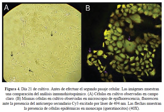 Finalmente, el ensayo de inmunofluoresencia efectuado, reveló que las células obtenidas correspondían a queratinocitos epidérmicos (Fig. 4).