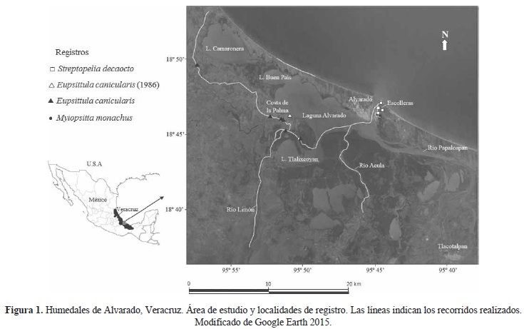 La presencia de especies fuera de su área nativa de distribución ha cobrado gran importancia, sobre todo cuando el hombre ha causado su establecimiento y expansión por el transporte e introducción de individuos más allá de sus barreras naturales (Blackburn et al. 2011). El proceso de invasión de especies puede reducir la biodiversidad, alterar la dinámica ecológica para la biota nativa, provocar severos daños a los servicios ambientales y salud pública, además de pérdidas económicas (Gurevich & Padilla 2004, March-Mifsut & Martínez-Jiménez 2007, Vellend et al. 2007, CANEI 2010). Aunque en México no se ha cuantificado con detalle el efecto de todas las especies exóticas, los datos disponibles indican que son un gran número los ecosistemas afectados (CANEI 2010). Algunas de estas especies están presentes sin causar daños aparentes por largos periodos y pasan inadvertidas hasta que el nivel de invasión o efectos negativos son severos (Gurevitch & Padilla 2004, Álvarez-Romero et al. 2008, CANEI 2010). Es necesario documentar nuevas localidades y el avance de estas invasiones, sobre todo en sitios de importancia biológica reconocida. En esta nota reportamos una paloma y dos psitácidos exóticos no incluidos en inventarios previos de los "Humedales de Alvarado", un Área de Importancia para la Conservación de las Aves (AICA, Ramírez-Bastida et al. 1999, Berlanga et al. 2008).