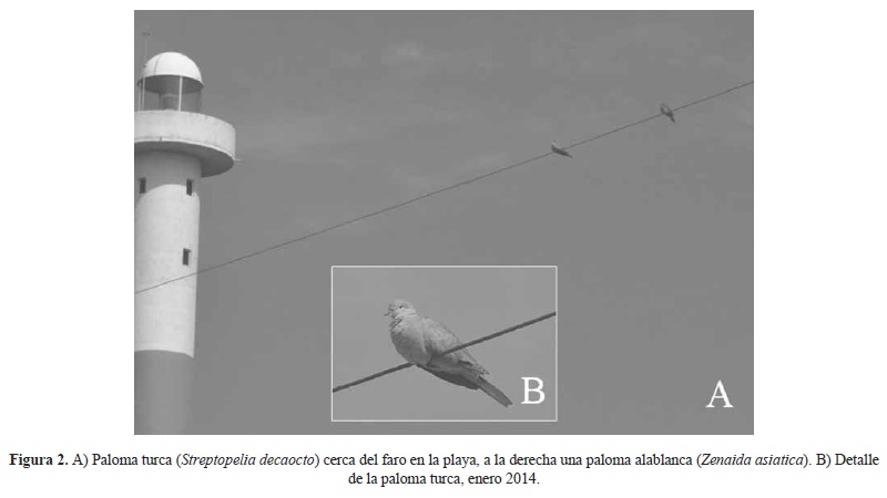 Paloma turca, Stieptopelia decaocto (Frivaloszky 1838). Se obtuvieron ocho avistamientos, posadas con otras palomas (Zenaida asiatica [Linnaeus, 1758], Columbina inca [Lesson, 1847] y C. talpacoti, Temmink, 1810), cerca de la playa en una pequeña localidad de pescadores, en zonas inundables empleadas como potreros, así como en alambrados y arbustos próximos a caminos asfaltados y brechas. Se registraron 20 individuos aislados en el manglar cerca de la desembocadura del río Limón (Cuadro 1, Figs. 1 y 2).