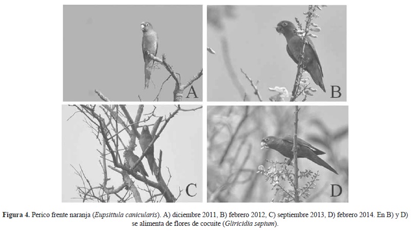 Perico frente naranja, Eupsittula canicularis (Linnaeus, 1758). En marzo de 1986 se registraron 16 individuos (Ramírez-Bastida obs. pers.), se atribuyeron a escapes de cautiverio y no se incluyeron en el listado del AICA. Se observaron de dos a 17 individuos entre el año 2011 y 2014 (Cuadro 1, Figs. 1 y 4). Formaron parvadas mixtas con pericos pecho sucio (E. nana) y se posaron incluso en el mismo árbol aunque separados. En febrero de 2012 y 2014 volaban en parejas. Ambas especies se alimentaron de cocuite, palo de sol o cacahuananche (Gliricidia sepium), cortaban racimos de botones y flores con el pico, los sostenían con una pata y algunos caían sin ser consumidos. El cocuite es un árbol nativo de usos múltiples, abundante en carreteras, caminos, huertos, cercos vivos y solares del sureste de México (Jiménez-Ferrer et al. 2008, Moreno-Casasola & Paradowska 2009). Mientras comían, toleraron nuestra presencia a unos cuantos metros. Hasta cinco parejas se ubicaron cerca de las casas, donde hay frutales, principalmente mangos, plátanos y papayas.