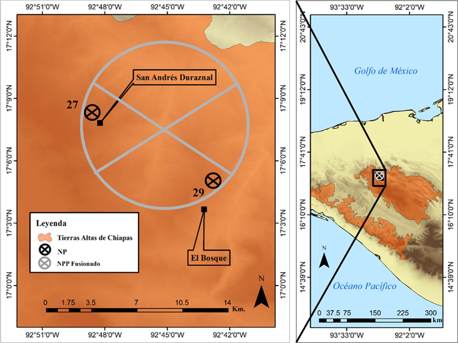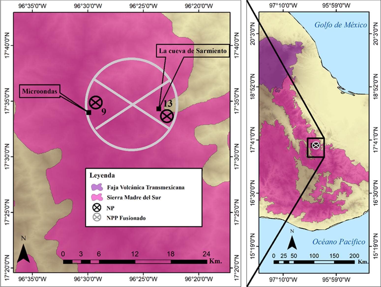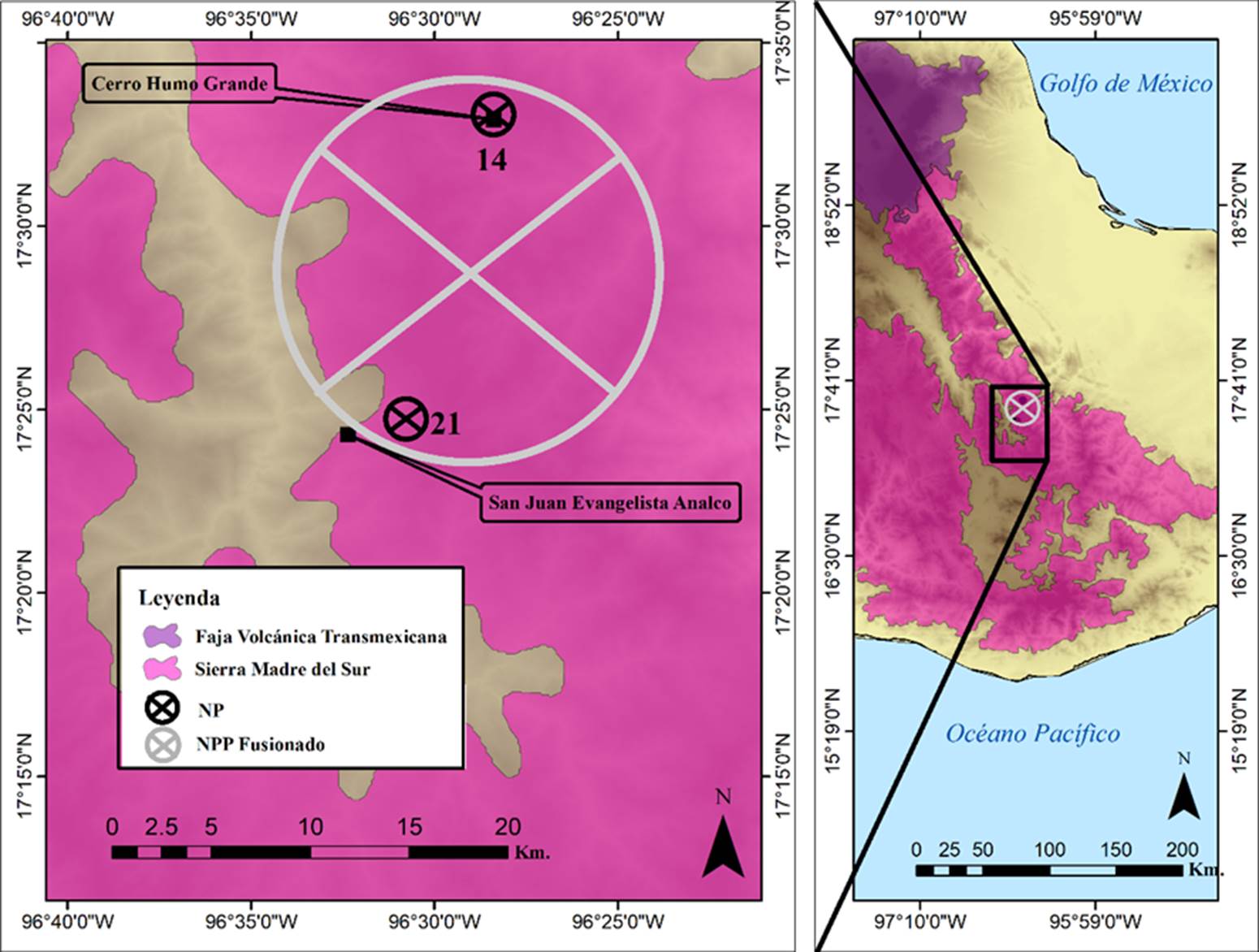 Los NP Prioritarios (NPP) de cada grupo fueron superpuestos con las provincias biogeográficas de Morrone et al. (2017) y con el marco cartográfico del Mapa Digital de México de INEGI (2017a), con el fin de ubicarlos a partir del punto cardinal más cercano de la característica geográfica (natural y/o social; por ejemplo: ríos, cuevas, cerros, cabeceras municipales, entre otros; INEGI, 2014d). Posteriormente, los NPP se superpusieron cartográficamente en QGIS Desktop 2.14.2 (QGIS Development Team, 2016) y en ArcGIS 10.1 (ESRI, 2012), con las capas digitales que representan las diferentes características ambientales, con el objetivo de caracterizar los NPP de una perspectiva físico-geográfica, de acuerdo con la propuesta de Álvarez-Mondragón y Morrone (2004) y García-Marmolejo et al. (2008). Dado que, como se mencionó anteriormente, los NP corresponden a la geometría de punto y carecen de dimensión espacial (Miguel-Talonia & Escalante, 2013; Escalante et al., 2017), se realizó una intersección de puntos con polígonos, en la que se integraron los atributos de las coberturas geográficas a los NP (ESRI, 2020). Las capas digitales fueron seleccionadas para caracterizar física, geográfica y ambientalmente a los NP, de acuerdo con Álvarez-Mondragón y Morrone (2004) y García-Marmolejo et al. (2008). La cobertura de rocas fue obtenida de INEGI (2017b), mientras que las capas de hipsometría (INEGI et al., 1990), climas (García & CONABIO, 1998), edafología (INEGI, 2014b), uso de suelo-vegetación (Rzedowski, 1978; Huber & Riina, 2003; INEGI, 2017c), hidrografía (Maderey & Torres-Ruata, 1990) y cuencas hidrográficas (INEGI et al., 2007), se obtuvieron del Portal de Geoinformación del Sistema Nacional de Información sobre la Biodiversidad (SNIB; Conabio, 2017).