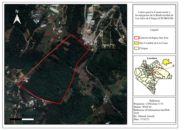 Figure 1 Geographic location of the study area at the Estación Biológica San José, San Cristóbal de Las Casas, Chiapas, Mexico (Google Earth).