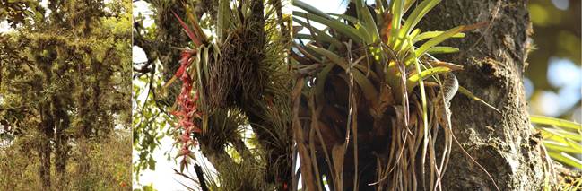 Figure 2 Habitat of Abronia lythrochila at the Centro para la Conservación e Investigación de la Biodiversidad de los Altos de Chiapas, Chiapas, Mexico. a) oak forest; b) epiphytic bromeliads Tillandsia prodigiosa (with large pendant inflorescence) and T. fasciculata; c) an Abronia lythrochila individual.