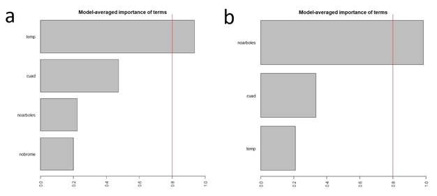 Figure 4 Ratio of the number of Abronia lythrochila individuals and temperature (a), and number of bromeliads and number of trees in sampling sites (b) at the Centro para la Conservación e Investigación de la Biodiversidad de los Altos de Chiapas, Chiapas, Mexico.