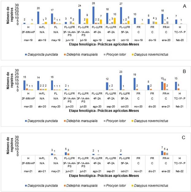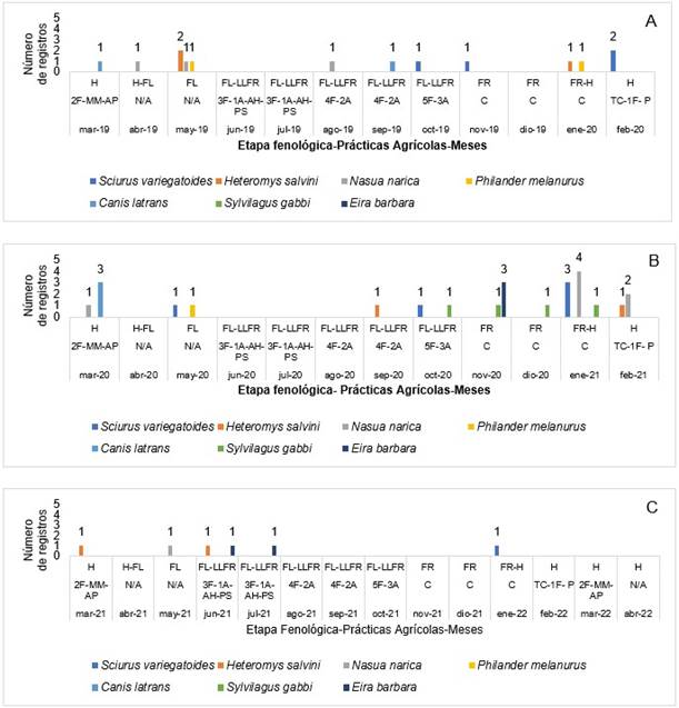 Figura 10 Registros de mamíferos con mayor abundancia en agroecosistemas con café, Rincón de Mora, San Ramón, Alajuela, Costa Rica. (A) Período marzo 2019-febrero 2020 (B) marzo 2020-febrero 2021 y (C) marzo 2021-febrero 2022. H: Hoja, FL: Flor, LLFR: Llenado fruto, FR: Fruto, 1F: Primer fumigación (B/Zn), 2F: Segunda fumigación (B/Zn), 3F: Tercera fumigación (B/Zn), 4F: Cuarta fumigación (B/Zn), 5F: Quinta fumigación, MM: Multi minerales, AP: Aplicación fungicida, AH: Aplicación herbicida, 1ª: Primer abonada (Fórmula Completa), 2ª: Segunda abonada (Fórmula Completa), 3ª: Tercer abonada (Fórmula Completa), PS: Poda sombra, C: Cosecha, N/A: No se hace nada.