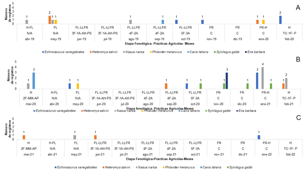 Figura 11 Registros de mamíferos con abundancia media en agroecosistemas con café, Rincón de Mora, San Ramón, Alajuela, Costa Rica. (A) Período marzo 2019-febrero 2020 (B) marzo 2020-febrero 2021 y (C) marzo 2021-febrero 2022. H: Hoja, FL: Flor, LLFR: Llenado fruto, FR: Fruto, 1F: Primer fumigación (B/Zn), 2F: Segunda fumigación (B/Zn), 3F: Tercera fumigación (B/Zn), 4F: Cuarta fumigación (B/Zn), 5F: Quinta fumigación, MM: Multi minerales, AP: Aplicación fungicida, AH: Aplicación herbicida, 1ª: Primer abonada (Fórmula Completa), 2ª: Segunda abonada (Fórmula Completa), 3ª: Tercer abonada (Fórmula Completa), PS: Poda sombra, C: Cosecha, N/A: No se hace nada.