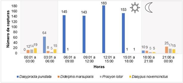 Especies con mayores registros de abundancia: la presencia de D. punctata osciló entre las 05:00 h hasta cerca de las 19:00 h con hábitos completamente diurnos y una actividad mayor entre las 12:00 h y las 15:00 h. Didelphis. marsupialis y P. lotor, de hábitos nocturnos, tuvieron una mayor actividad de las 21:00 h a las 03:00 h, mientras que D. novemcinctus en comparación con las especies anteriores, extendió un poco su ámbito de mayor actividad (21:00-04:30 h) (Fig. 13).