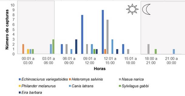Especies con registros de abundancia media: con estas especies se dio un pico de interacción entre las 09:00 h a las 15:00 h. La especie que tuvo mayor presencia en ese periodo de actividad fue E. variegatoides, seguida de N. narica, C. latrans, N. narica, S. gabbi y H. salvini mostraron un comportamiento tanto diurno como nocturno. E. barbara y S. variegatoides se registraron solamente en horario diurno mientras que P. melanurus nada más en horas de la noche de las 00:01 h a las 03:00 h (Fig. 14)