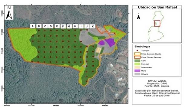 Área de estudio. El estudio se realizó en dos fincas colindantes con un área de 6,2 ha, ubicadas en la comunidad de Rincón de Mora (10° 0’ 44’’ N, 84° 7’ 28’’ O, y 10° 0’ 34’’ N, 84° 7’ 28’’ O) a 2.5 Km al sur del distrito de San Rafael, cantón de San Ramón, provincia de Alajuela, Costa Rica. El paisaje que predomina en la zona son los agroecosistemas con café con sombra. Las fincas objeto de estudio se ubican entre los 1,200 y 1,250 m s.n.m., con pendientes de 15, 30 y 45 % (Sánchez & Moya, 2018). El tipo de sombra presente en estos agroecosistemas con café es policultivo comercial en el cual los árboles originales del bosque son reemplazados por otras especies útiles de sombrío (Moguel & Toledo, 1999).