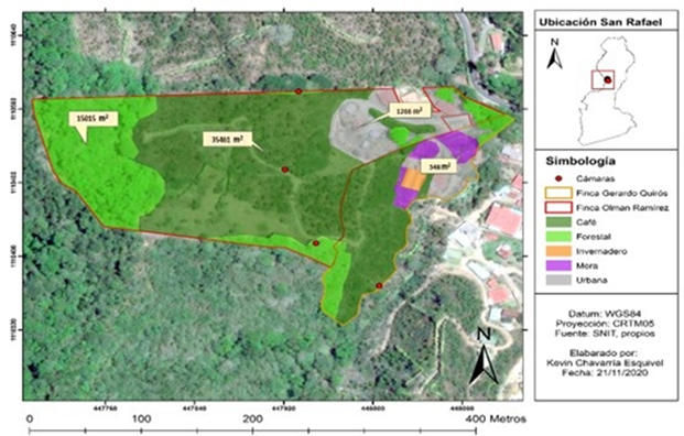 En esta zona se presenta una precipitación de 3,461 mm por año, con una temperatura promedio de 20 °C y una humedad relativa de 92 % (CIGEFI, 2019). El uso de suelo de las fincas es de 3.5 ha en agroecosistema con café, 1.5 ha en forestal, 1,266 m2 de cultivo de mora (Rubus spp.) (mora), un invernadero de 343 m2 y el área restante 1,266 m2 corresponde a construcciones (Fig. 1).