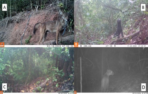 Figura 7 Especies de mamíferos grandes capturados en agroecosistemas con café, Rincón de Mora, San Ramón, Alajuela, Costa Rica. Período marzo 2019-febrero 2022. (A) Canis latrans (Coyote), (B) Eira barbara (Tolomuco), (C) Galictis vittata (Grisón) y (D) Puma concolor (Puma).