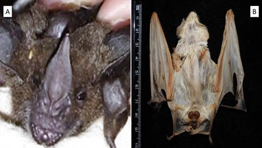 Mamíferos voladores: en cuanto a los mamíferos voladores se logró registrar dos especies de murciélagos (orden Chiroptera): Carollia perspicillata Linnaeus (murciélago candelero) (mediante captura) y Diclidurus albus Wied-Neuwied (murciélago blanco) (encontrado en campo) (Fig. 8).