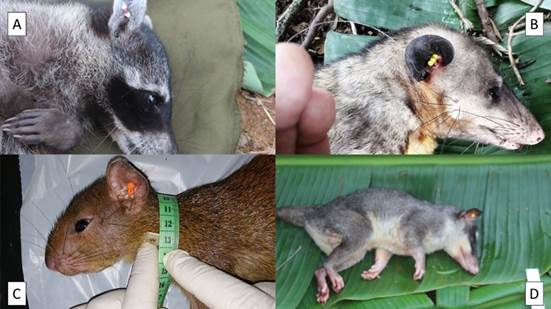Figura 9 Captura y marcaje de mamíferos en agroecosistemas con café para determinar abundancia, Rincón de Mora, San Ramón, Alajuela, Costa Rica. Período marzo 2019-febrero 2022. (A) Captura de Procyon lotor (Mapache), (B) Captura de Didelphis marsupialis, (C) Captura de Dasyprocta punctata y (D) Captura de Philander melanurus.