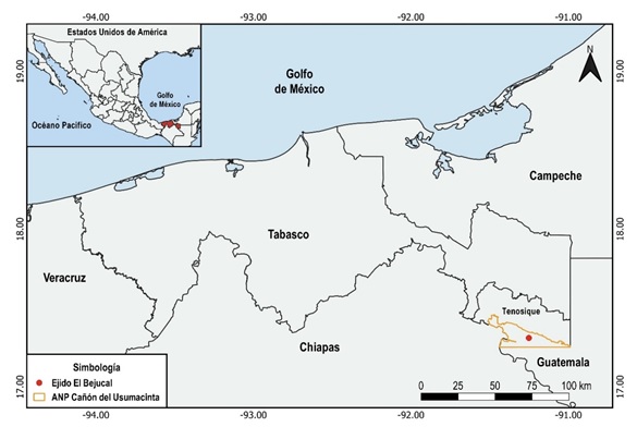 El ejido El Bejucal abarca 1 502 ha que se encuentran dentro del APFF “Cañón del Usumacinta” (Fig. 1). Originalmente, esta región se encontraba cubierta por bosque alto tropical perennifolio y bosque de galería, de la que quedan solamente 247 ha de bosque alto tropical primario y secundario (severamente degradada) y 21 ha de bosques de galería (CONANP, 2015). Los asentamientos humanos ocupan 27 ha, mientras que 1 200 ha están destinadas a usos agrícolas y ganaderos, con pastizales intercalados con agricultura anual y acahuales (parcelas anteriormente agrícolas que se encuentran en descanso y presentan vegetación secundaria), destacando algunas hectáreas de cultivo industrial de palma de aceite africana (Elaeis guineensis; 24 ha) y plantaciones forestales de teca (Tectona grandis; 8 ha) (López & Saavedra-Guerrero, 2018).