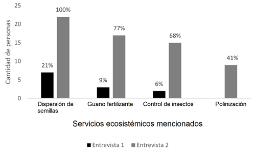 En relación con el mecanismo de dispersión de semillas, el 36% de los entrevistados pudieron definirlo proporcionando ejemplos. Sin embargo, no todos fueron capaces de asociar a los murciélagos con este servicio. El 100% de los familiarizados con el término identificaron a las aves, el viento o mamíferos como las ardillas como los principales agentes dispersores.