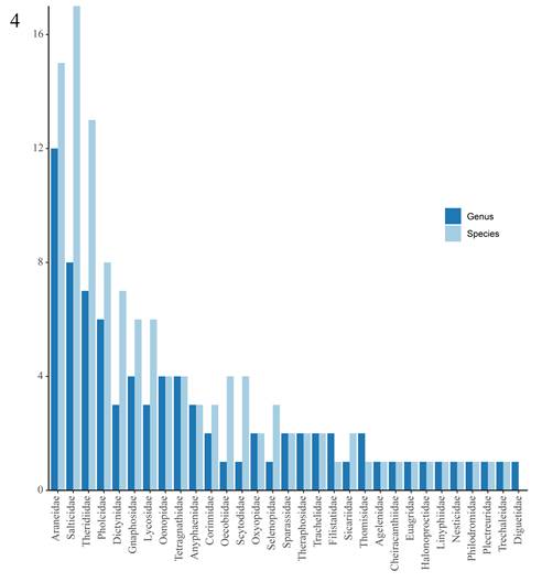 Spider species list of Sinaloa. A total of 31 families, 82 genera, and 118 species are distributed in Sinaloa (Table 1). Salticidae (8 genera and 17 species), Araneidae (12 genera and 15 species), and Theridiidae (7 genera and 13 species) are the most diverse families (Fig. 4). Eleven families have only one recorded species in Sinaloa (Fig. 4).