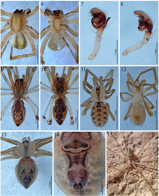 Figures 5-15 Hibana incursa. 5-8. 5. Habitus male, dorsal view. 6. Same, ventral view. 7. Male palp, ventral view. 8. Same, retrolateral view. Diguetia sp. 9-10. 9. Habitus, dorsal view. 10. Same, ventral view. Filistatoides sp. 11-12. 11. Habitus, dorsal view. 12. Same, ventral view. Crossopriza lyoni. 13-15. 13. Habitus female, dorsal view. 14. Epigynum, ventral view. 15. Habitus female in situ, dorsal view.
