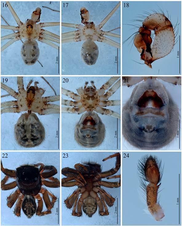 Figures 16-24 Physocyclus globosus 16-21. 16. Habitus male, dorsal view. 17. Same, ventral view. 18. Male palp, retrolateral view. 19. Habitus female, dorsal view. 20. Same, ventral view. 21. Epigynum, ventral view. Hasarius adansoni 22-24. 22. Habitus male, dorsal view. 23. Same, ventral view. 24. Male palp, ventral view.