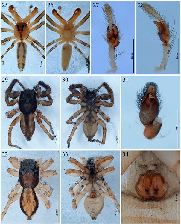 Figures 25-34 Lyssomanes mandibulatus. 25-28. 25. Habitus male, dorsal view. 26. Same, ventral view. 27. Male palp, ventral view. 28. Same, retrolateral view. Menemerus bivittatus. 29-34. 29. Habitus male, dorsal view. 30. Same, ventral view. 31. Male palp, ventral view. 32. Habitus female, dorsal view. 33. Same, ventral view. 34. Epigynum, ventral view.
