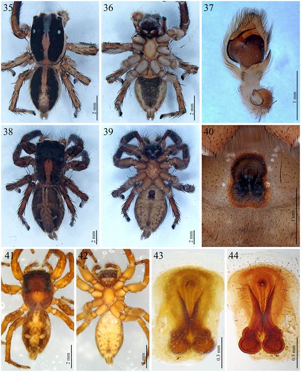 Figures 35-44 Plexippus paykulli. 35-40. 35. Habitus male, dorsal view. 36. Same, ventral view. 37. Male palp, ventral view. 38. Habitus female, dorsal view. 39. Same, ventral view. 40. Epigynum, ventral view. Plexippus petersi. 41-44. 41. Habitus female, dorsal view. 42. Same, ventral view. 43. Epigynum, ventral view. 44. Same, dorsal view.