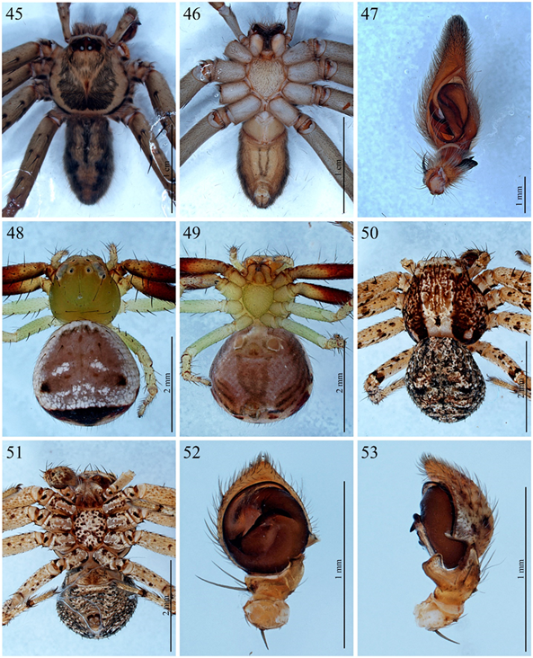 Figures 45-53 Heteropoda venatoria. 45-47. 45. Habitus male, dorsal view. 46. Same, ventral view. 47. Male palp, ventral view. Synema sp. 48-49. 48. Habitus, dorsal view. 49. Same, ventral view. Xysticus lassanus. 50-53. 50. Habitus male, dorsal view. 51. Same, ventral view. 52. Male palp, ventral view. 53. Same, retrolateral view.