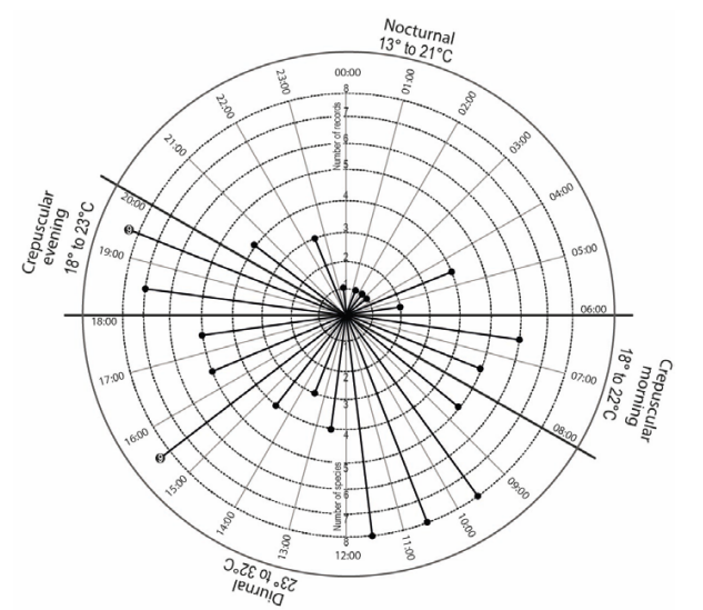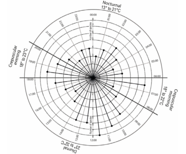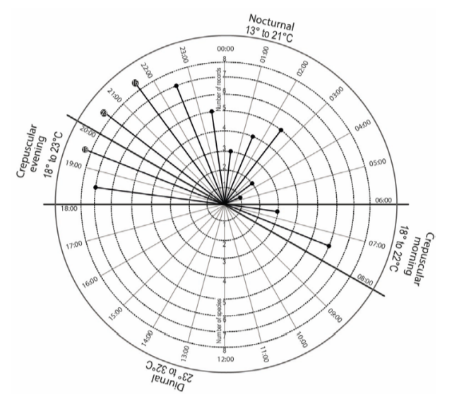 Due to the duration of periods of the day is different for various authors, some of them take a twilight time interval with the duration of 120 minutes before and after sunrise and sunset, respectively (Bridges et al., 2004) or 60 minutes as well (Romero-Muñoz et al., 2010; Ross et al., 2013; Ikeda et al., 2016). In this study, four categories of activity were used: crepuscular morning (06:00-08:00), crepuscular evening (18:00-20:00), and the intervals between these were diurnal (08:00-18:00) and nocturnal (20:00-06:00) (Maffei et al., 2005, Monroy-Vilchis et al., 2011). If at least 50 % of the records of each species observed correspond to that time, then were classified in one of these categories. But, if the percentage were less than 50% of the records, then they were considered as cathemeral (Maffei et al., 2005; Monroy-Vilchis et al., 2011; Pérez-Irineo & Santos-Moreno, 2021). This last term (cathemeral) is applied to the pattern of an organism’s activity that occurs during both the light and dark portions of the 24-h cycle (Donati & Borgognini-Tarli, 2006). Thus, a cathemeral organism does not strictly adhere to a diurnal, nocturnal, or crepuscular phase, but rather shift its activity throughout the 24 h (Clarke et al., 1995; Curtis & Ramunsen, 2006).