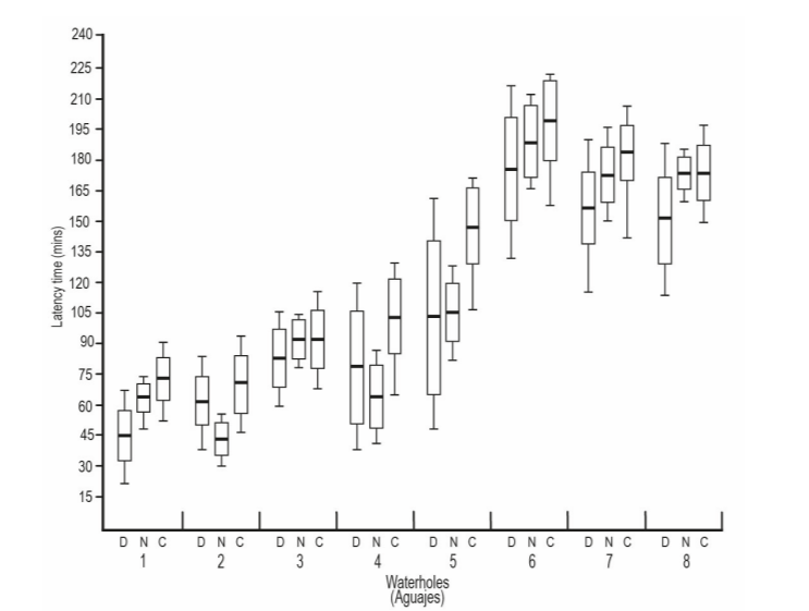 A parametric one-way ANOVA test was used to examine differences among natural waterholes and the average time between visits of all species. Previously, the normality and homogeneity of variance of the data were checked with the Anderson-Darling test. Then, data were analyzed with Oriana software version 4 (Kovach, 2011) for circular statistics using the Rayleigh test of uniformity and Rao’s spacing test, to examine data that are distributed in a circular manner, such as time (Lehner, 1996).