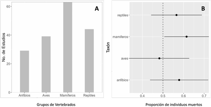 Figura 4 A) Número de registros de atropellamiento para cada grupo taxonómico encontrados en los estudios revisados para el neotrópico. B) Tamaño de efecto de las carreteras sobre los grupos taxonómicos de vertebrados.