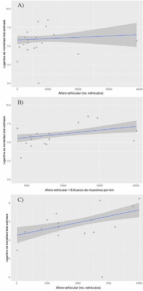 Figura 5 Modelos lineales del número de muertes por atropellamiento (log) y A) el aforo vehicular, B) el aforo vehicular controlado por el esfuerzo de muestreo y C) para un aforo vehicular < 10,000 vehículos por día.