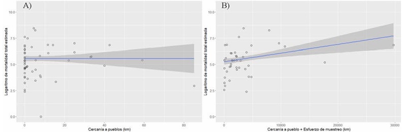 | lm(log(mort_tot_est)~dist_pob+esf_mues_km) | Dist. poblado | 2.7x10-03 | 8.3x10-03 | 0.32 | |||