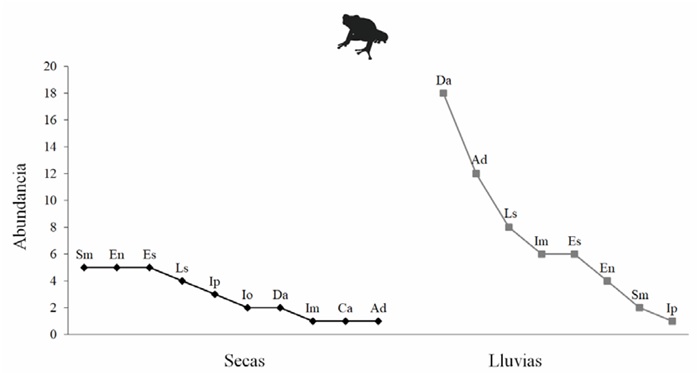 Figura 4 Curvas de rango abundancia de los anfibios registrados en la estación seca y en la estación de lluvias en la selva tropical caducifolia de La Sandía, Acatlán de Osorio, Puebla.