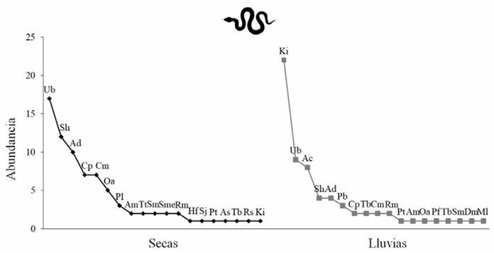 La comunidad de reptiles presentó una distribución heterogénea con respecto a la abundancia en ambas estaciones (Secas 1 0 RLE = 0.62; Lluvias 1 0 RLE = 0.55). Sin embargo, para cada especie se observaron cambios en la abundancia entre estaciones. En la estación seca observamos la dominancia de las lagartijas Urosaurus bicarinatus (Duméril, 1856), Sceloporus horridus (Wiegmann, 1834) y Aspidoscelis deppii (Wiegmann, 1834). En la estación de lluvias, la especie dominante fue la tortuga Kinosternon integrum (Le Conte, 1854). Esta especie de tortuga dulceacuícola sólo fue registrada con un individuo en la estación seca. Ambas estaciones compartieron once especies de reptiles y se encontraron especies únicas para cada estación. Las especies exclusivas en la estación seca fueron A. sackii (Wiegmann, 1834), Hemidactylus frenatus (Schlegel, 1836), Pseudoleptodeira latifasciata (Günther, 1894), Rena hesperia, Salvadora mexicana (Duméril, Bibron & Duméril, 1854), Sceloporus jalapae, y Trimorphodon tau (Cope, 1869). Las especies exclusivas en la estación de lluvias fueron A. costata (Cope, 1878), Drymarchon melanurus (Duméril, Bibron & Duméril, 1854), Micrurus laticollaris (Peters, 1869), Phyllodactylus bordai (Taylor, 1942), Pseudoficimia frontalis (Cope, 1864) y Tantilla bocourti (Fig. 5).