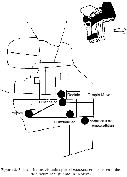 Así pues, este tipo de evidencias ponen al descubierto la descentralización presente en la disposición espacial de las instituciones destinadas al culto religioso en México-Tenochtitlan, hecho que enfatiza el carácter segmentario que define al altepetl al cual hemos hecho alusión con anterioridad. El tlahtoani se hallaba sujeto al ejercicio de una soberanía personal (o tlahtocayotl) que debía garantizar la estabilidad y el equilibrio de los diferentes segmentos constitutivos del propio altepetl. Por ello, los rituales que rodeaban la entronización del gobernante suponían un acto público idóneo para renovar dicha alianza ontológica. Al mismo tiempo, el inicio del nuevo reinado se afianzaba mediante un ritual político encaminado a efectuar una cíclica legitimación del poder a través del viaje iniciático que el propio tlahtoani emprendía con la visita a una serie de estaciones simbólicas dentro de la geografía sagrada de México-Tenochtitlan (Figura 3). Hernando de Alvarado Tezozómoc realiza una vivaz descripción de este tipo de ceremonias asociadas a la unción real cuando relata el acceso del tlahtoani Tízoc al icpalli tenochca en 1481: