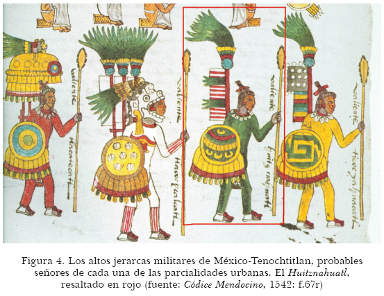 La "casa sagrada" de Teopan en el Huitznáhuac disponía de su propia jerarquía religiosa y administrativa a la cual se aludía con diferentes títulos y dignidades. Fray Bernardino de Sahagún menciona la existencia del huitznahuac tiachcauh, quien lideraba el séquito de sacerdotes y principales que acompañaba la figura de Huitzilopochtli.45 Asimismo, el huitznahuac teohuatzin seguía en rango al mexicatl teohuatzin y se encargaba de prestarle ayuda complementaria en sus quehaceres diarios.46 Varias fuentes coinciden en el hecho de que el cargo que se escondía bajo el título honorífico de huitznahuatl fue ostentado durante el reinado de Motecuzohma II (1502-1520) por Motelchiuhtzin,47 quien bautizado con el nombre de don Andrés de Tapia ejerció la gobernación indígena de ciudad de México entre 1525 y 1530/1532.48 El huitznahuatl, conjuntamente al ticocyahuacatl, al tlacateccatl y al tlacochcalcatl, integraba la cúpula militar en la sociedad mexica-tenochca (Figura 4).