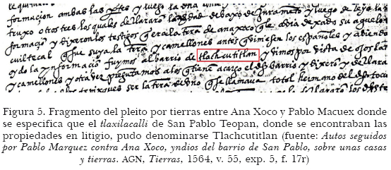 Cabe recordar que, tras la conquista de México-Tenochtitlan en 1521 y la subsiguiente implementación de la llamada "traza española" por parte del alarife Alonso García Bravo, a partir de 1524 las antiguas parcialidades urbanas, así como sus residentes y autoridades, sufrieron un profundo proceso de evangelización. De este modo, al noroeste de la urbe se localizó Cuepopan (Santa María la Redonda), al noreste Atzacoalco (San Sebastián), al sudoeste Moyotlan (San Juan) y al sudeste Teopan (San Pablo). Al frente de cada una de estas cuatro parcialidades se localizó una parroquia con advocación al santo/a mencionado/a, cuya construcción empezó hacia 1525 bajo el patrocinio y supervisión de fray Pedro de Gante.11 Asimismo, cada parcialidad indígena englobó un número determinado de tlaxilacaltin que, en la mayoría de los casos, sobrevivieron claramente a la Conquista y no sufrieron modificaciones sustanciales a nivel espacial y estructural hasta las Reformas Borbónicas de la segunda mitad del siglo XVIII.12 Desde la década de 1560 disponemos de varios documentos privados y con carácter público donde se atestigua que el distrito central de la parcialidad de San Pablo Teopan era reconocido con el nombre de Teocaltitan (Cerca del templo). Un pleito inédito fechado de 1561 acontecido entre María Tlaco Yehual y el alcalde indígena Luis de Paz por la propiedad de un camellón o huerto doméstico en dicha parcialidad probablemente sea la fuente documental más temprana que tengamos con referencia a este importante tlaxilacalli, puesto que éste no aparece registrado en el catálogo vecinal de Alfonso Caso (1956). En la resolución final del litigio se esclarece: