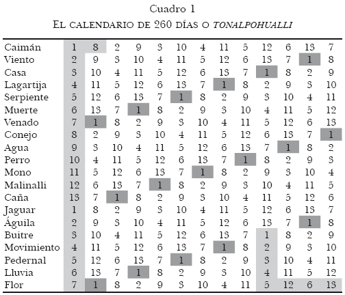El tonalpohualli se componía de veinte signos y trece numerales, cuya combinación conformaba un ciclo de 260 días, pues se necesitaba este intervalo para volver a encontrar la misma fecha compuesta del mismo signo y mismo numeral. Los españoles dieron el nombre de "fiestas móviles" a las de este calendario, puesto que eran independientes del calendario solar y se celebraban cada año en épocas distintas. Si bien Sahagún registra un número total de dieciocho fiestas móviles (HG, L. II, 14, 94-98) contando quince fiestas anuales, una fiesta de boda y dos fiestas "por años interpolados", en realidad seguramente había un número mucho mayor de ellas. En efecto, hay que añadir las fiestas celebradas por cuerpos artesanales: las tejedoras, los mercaderes, los lapidarios, etcétera, que mencionaremos en su lugar. Además, en su relación de los edificios del Templo de México (HG, L. II, Ap. 2, 158-164), Sahagún menciona la fecha de ocho fiestas móviles que se celebraban en varios edificios.8