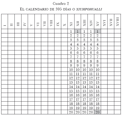 El Cuadro 2 muestra que, al contrario del calendario de 260 días que establece una separación de 21 días entre cada signo, el de 365 días basa sus conteos en ciclos de solamente veinte días. Por lo tanto, la fiesta se celebra el vigésimo día y el ayuno empieza el día primero, en caso de durar veinte días, o el día primero de los meses anteriores, en caso de durar múltiples de veinte.