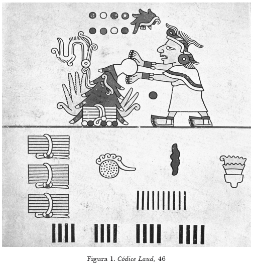 La Figura 1 muestra la diosa del agua vertiendo un jarro de agua sobre un brasero de fuego. Están escritas dos fechas: 1 Agua frente a su vientre (el numeral Uno y el signo Agua expresado por el jarro que se vierte); 8 Agua arriba (el numeral Ocho y el signo Agua dibujado de manera tradicional). Remitiéndonos al Cuadro 1, vemos que la fecha de la fiesta 8 Agua está precedida, veinte días antes, por 1 Agua. Es decir, veinte días calculados como lo he explicado arriba separan 1 Agua, día en que podemos conjeturar que empezó el ayuno, y 8 Agua, día de la fiesta.