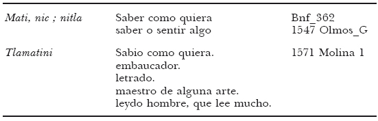 Si el verbo imati "conocer" parece relacionarse con todos los tipos de tlacuilolli, ¿es lo mismo con el verbo mati "saber"? La respuesta es negativa. El verbo mati se relaciona solamente con un cierto tipo de tlacuilolli. En los cuatro casos 56 en los cuales aparecen en la misma frase las palabras tlacuilolli y tlamatini, siempre aparece la palabra amoxtli "libro" y en tres casos el binomio in tlilli in tlapalli "el negro, los colores" que es la expresión metonímica para la escritura.