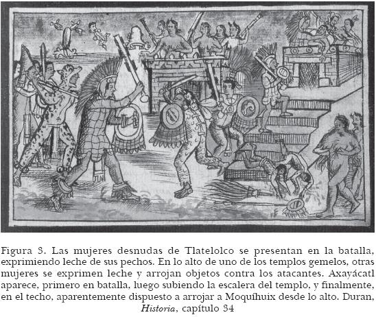 Durán y Tezozómoc registraron otro lance que pone de relieve el papel de la sexualidad femenina durante la contienda. Cuando los vencedores se aproximaban a Tlatelolco, salió a su encuentro un grupo de mujeres desnudas (figura 3). Según Tezozómoc eran dos o tres mujeres "con las bergüengas de fuera y las tetas, y enplumadas, con los labios colorados de grana, motexando a los mexicanos de cobardía grande. Benían estas mugeres con rodelas y macanas para pelear con los mexicanos, y tras de estas mugeres siete u ocho muchachos desnudos, con armas [...]" 33 No hay indicación de que las mujeres hayan empleado las armas que llevaban para combatir; en vez de eso, su agresión tomó un aspecto explícitamente sexual: